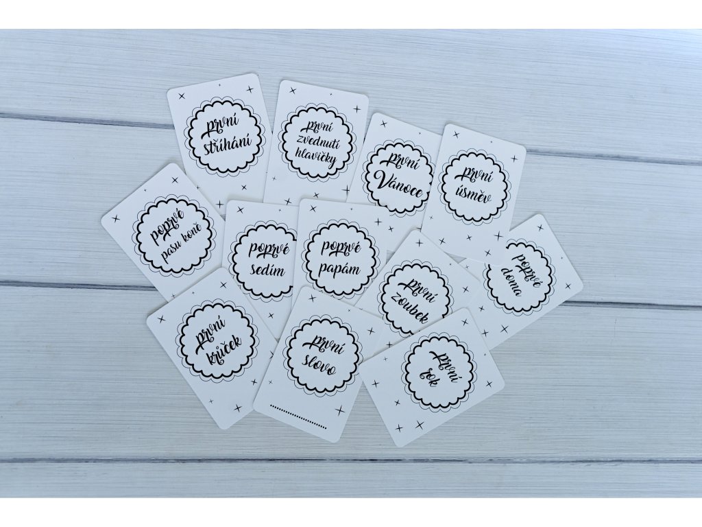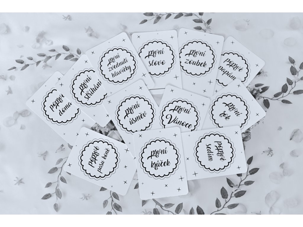 Set 15 jedinečných milníkových kartiček obsahuje: poprvé doma, poprvé papám, poprvé pasu koně, poprvé sedím, poprvé stojím, první koupání, první krůček, první rok, první slovo, první stříhání, první úsměv, první Vánoce, první zoubek, první zvednutí hlavičky a kartička AHOJ SVĚTE - ZDARMA.