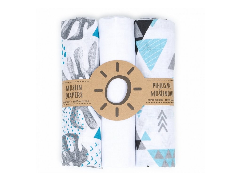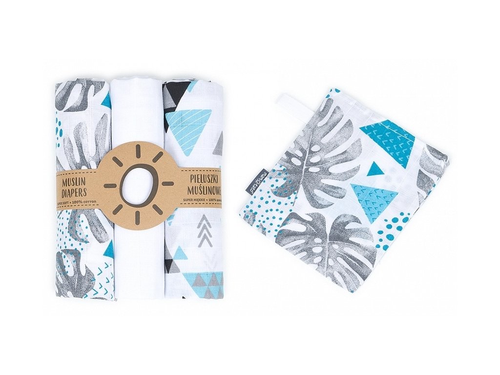 Mušelínové plenky 3ks + žínka zdarma - listy, trojúhelník, bílá - Mamo Tato