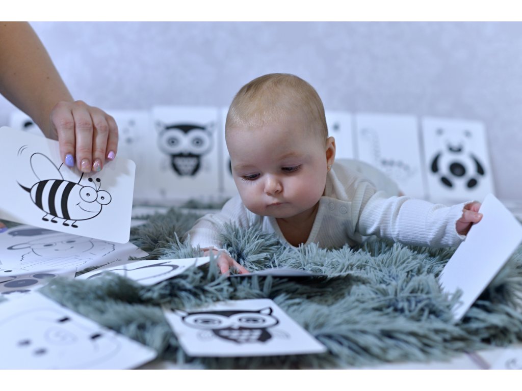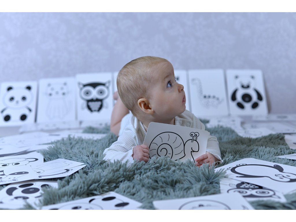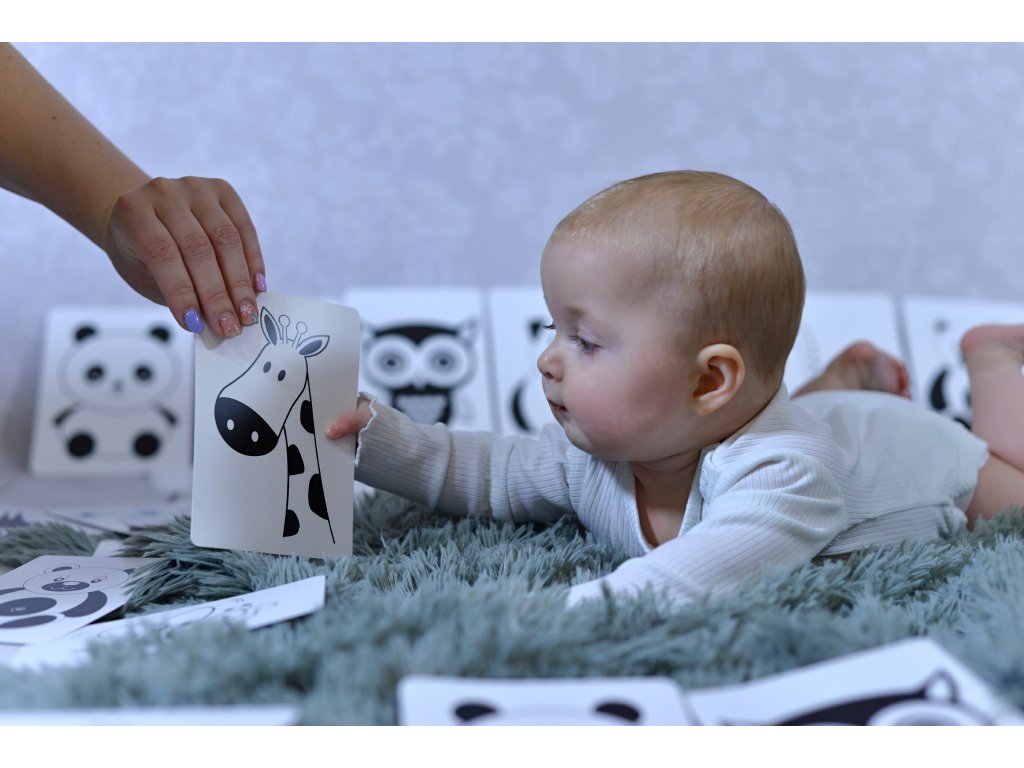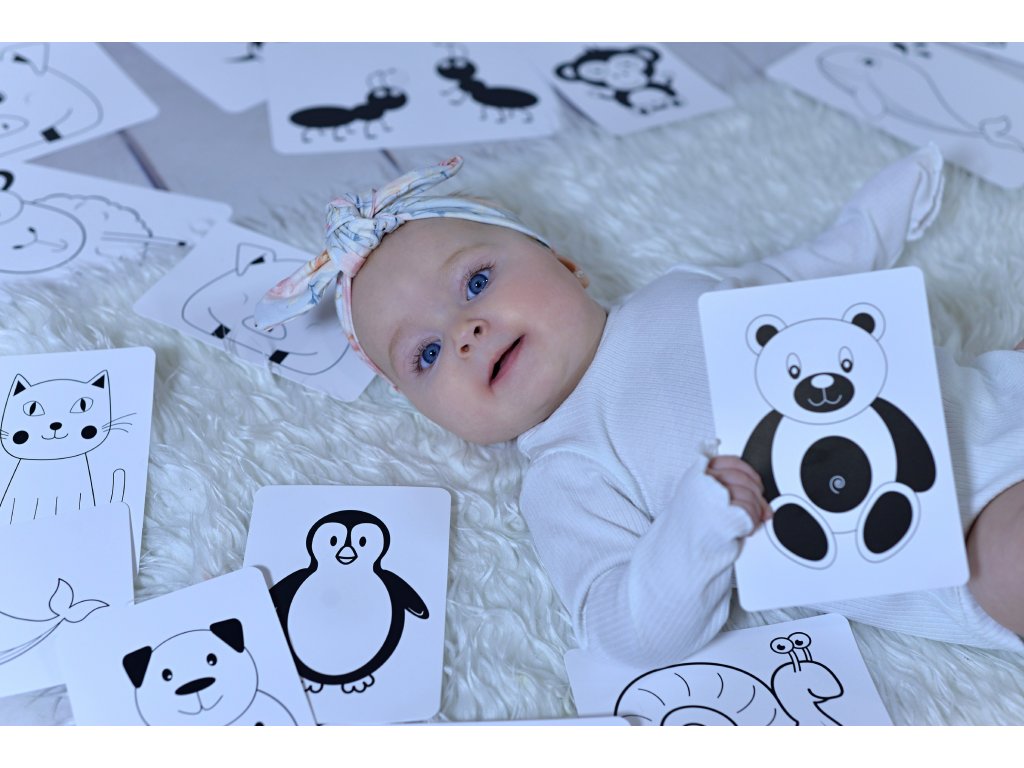 Kontrastní černobílé karty začíná miminko vnímat přibližně od 2. týdne narození a to ve vzdálenosti maximálně 50 cm.