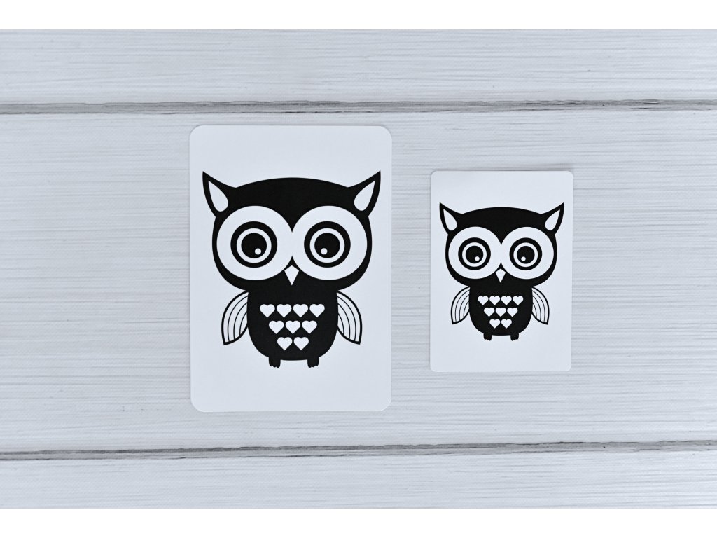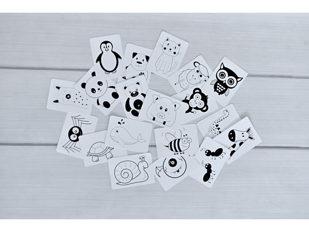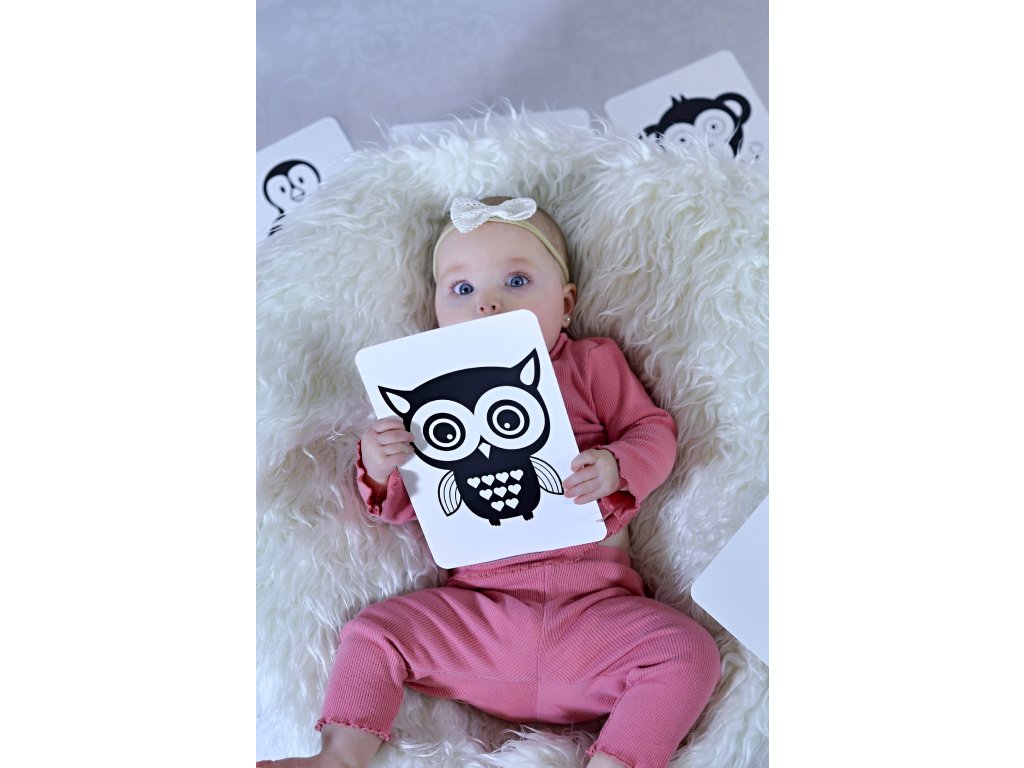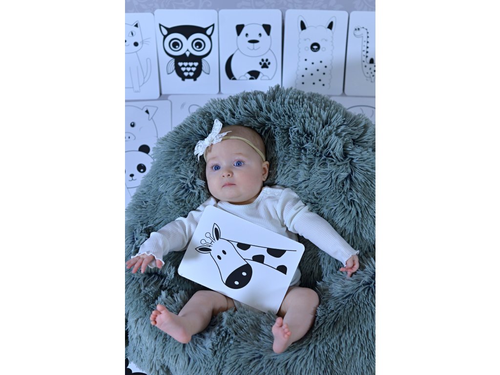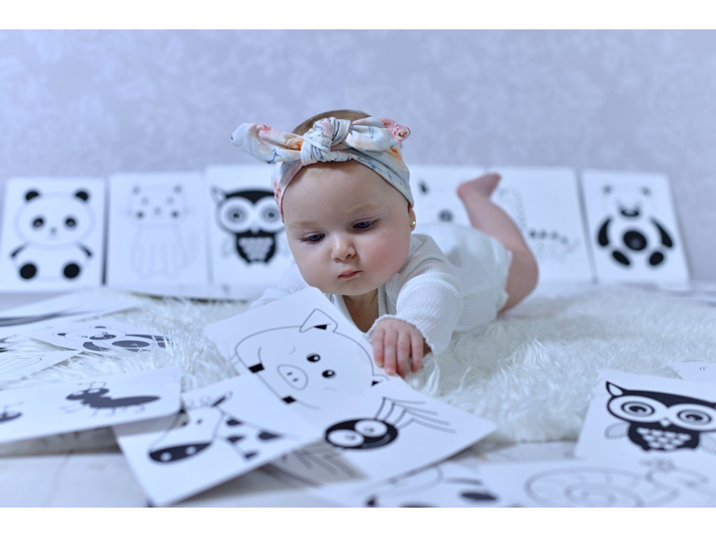 Kontrastní černobílé karty začíná miminko vnímat přibližně od 2. týdne narození a to ve vzdálenosti maximálně 50 cm.
